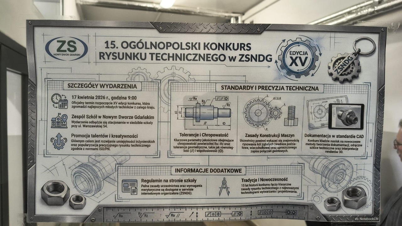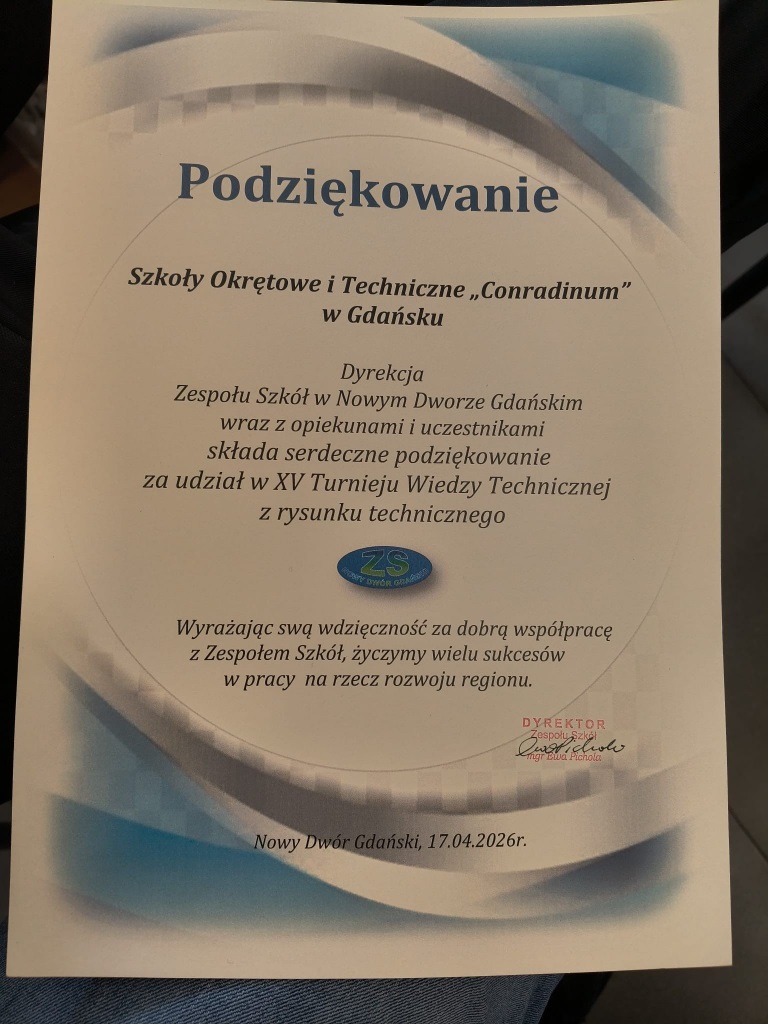 Conradinowcy z 4 L - Łukasz Aleksandrowicz i Jan Czaja reprezentowali dziś nas podczas XV Turnieju Wiedzy Technicznej z rysunku technicznego, który odbył się w Zespole Szkół w Nowym Dworze Gdańskim.