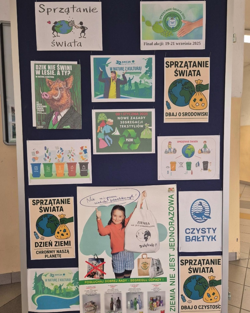 Tegoroczny finał 32 akcji Sprzątania Świata odbywał się w dniach 19-21.09.2025r. pod hasłem "W naturę z kulturą". Z tej okazji gazetkę edukacyjną na korytarzu szkolnym przygotowała nauczycielka biologii p. Wioletta Pukszta.