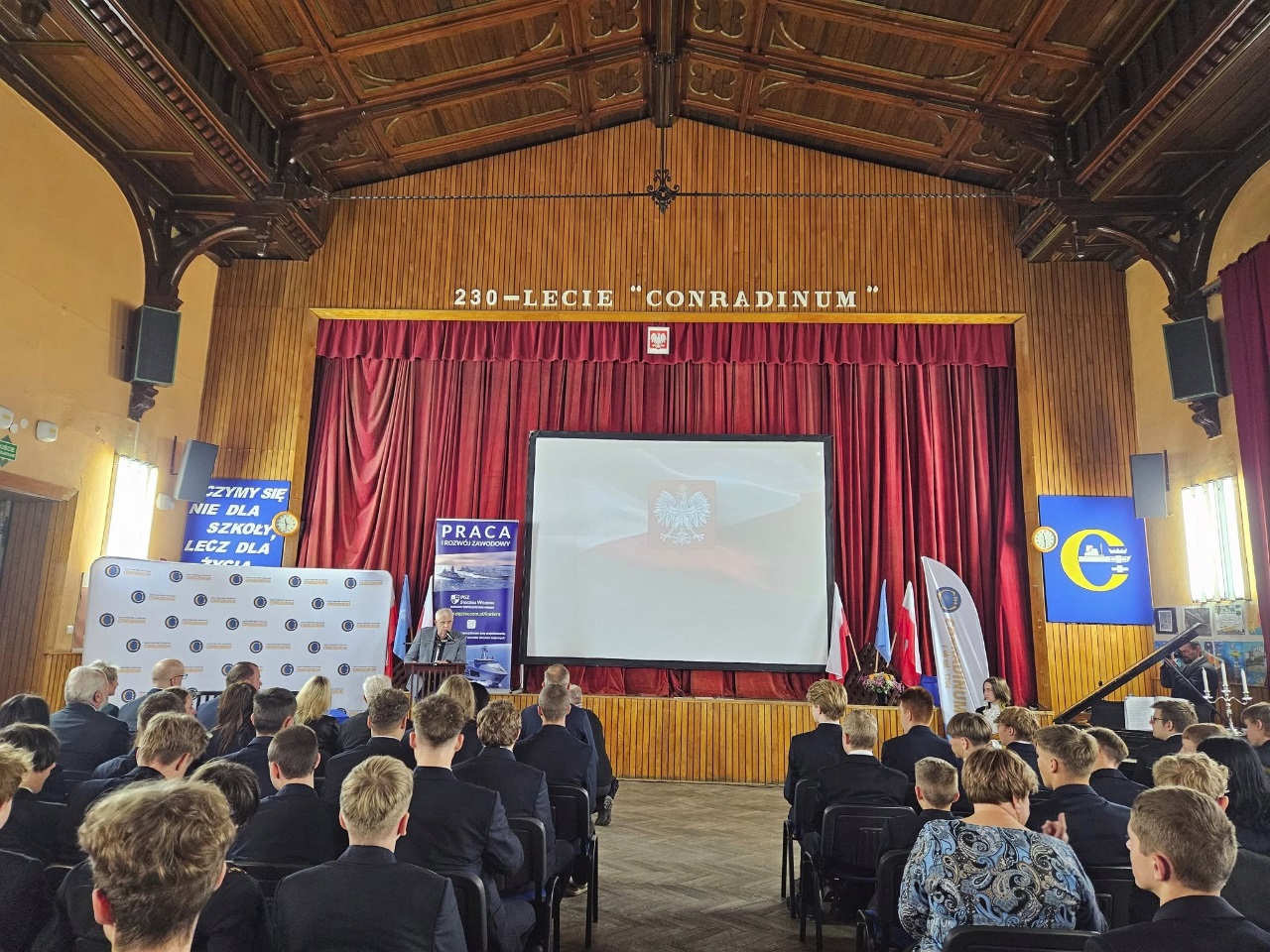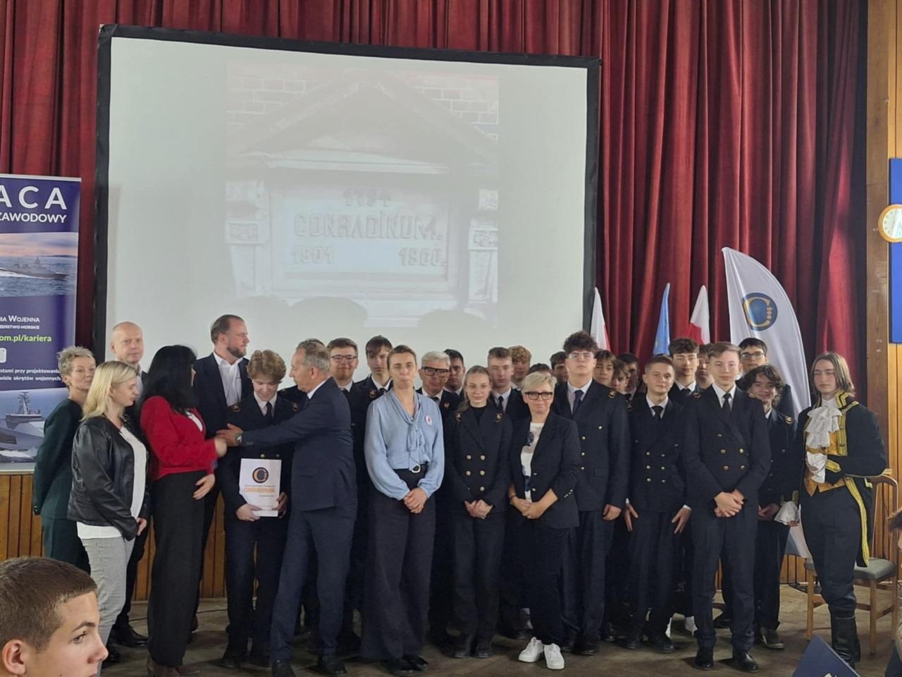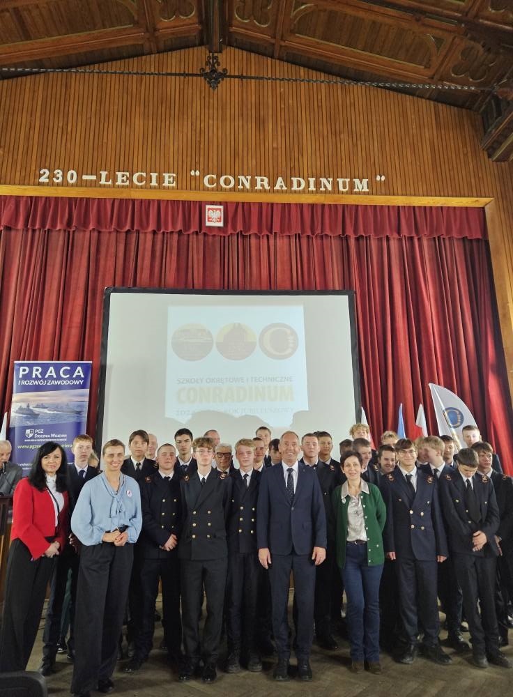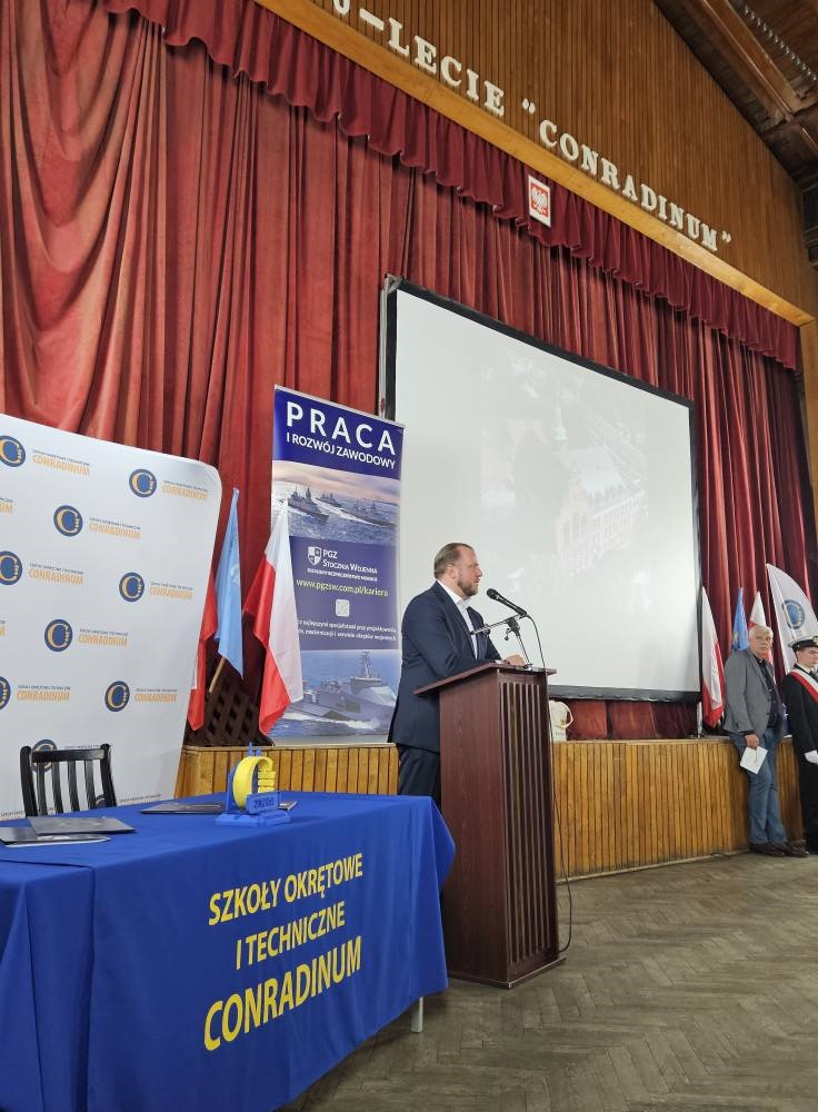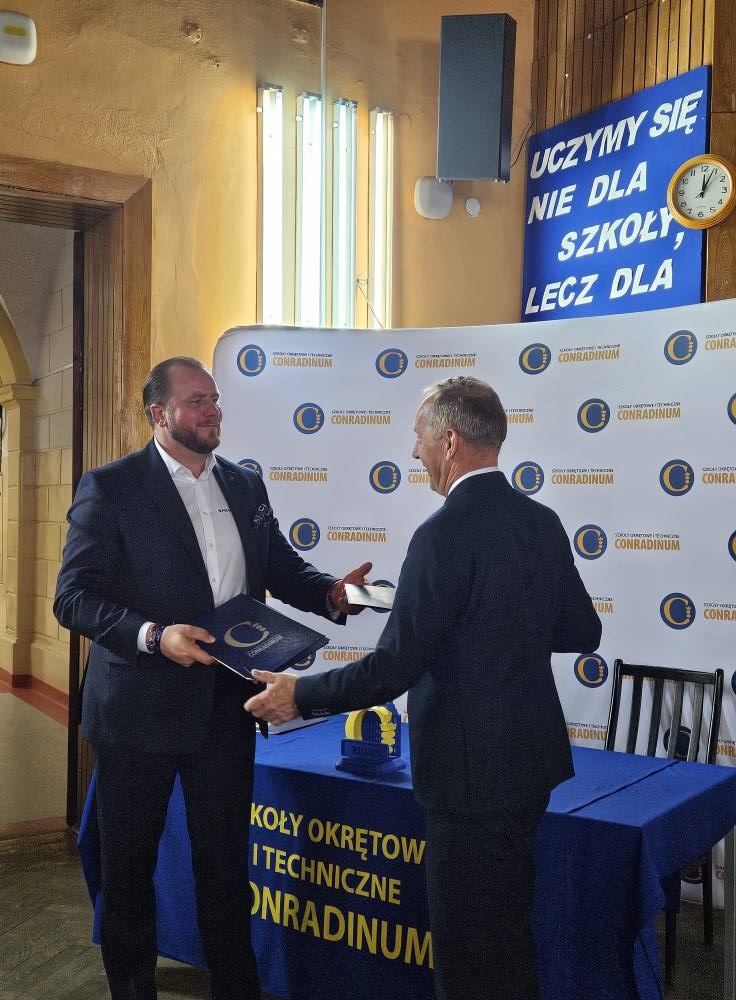 porozumienie w obecności gości i wszystkich klas pierwszych podpisali: w imieniu PGZ Stocznia Wojenna Prezes Zarządu p. Marcin Ryngwelski oraz w imieniu SOIT Conradinum p. Dyrektor Andrzej Butowski