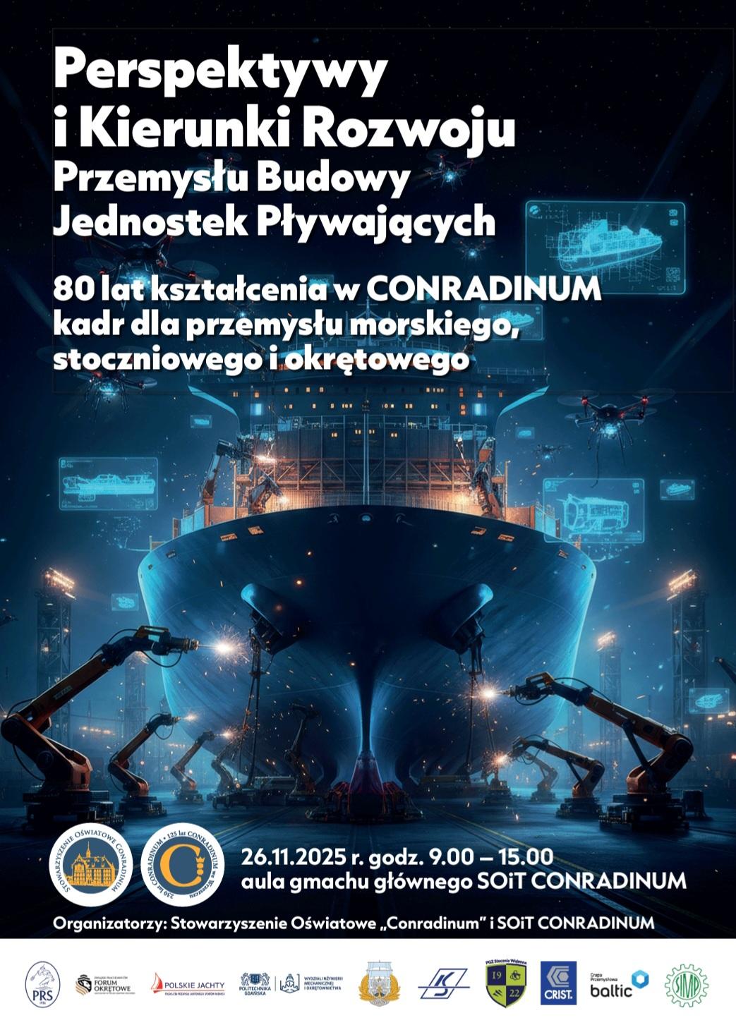 26 listopada 2025 r. z okazji Jubileuszu 80-lecia kształcenia w CONRADINUM kadr dla przemysłu morskiego, stoczniowego i okrętowego odbędzie się u nas konferencja PERSPEKTYWY i KIERUNKI ROZWOJU PRZEMYSŁU BUDOWY JEDNOSTEK PŁYWAJĄCYCH.