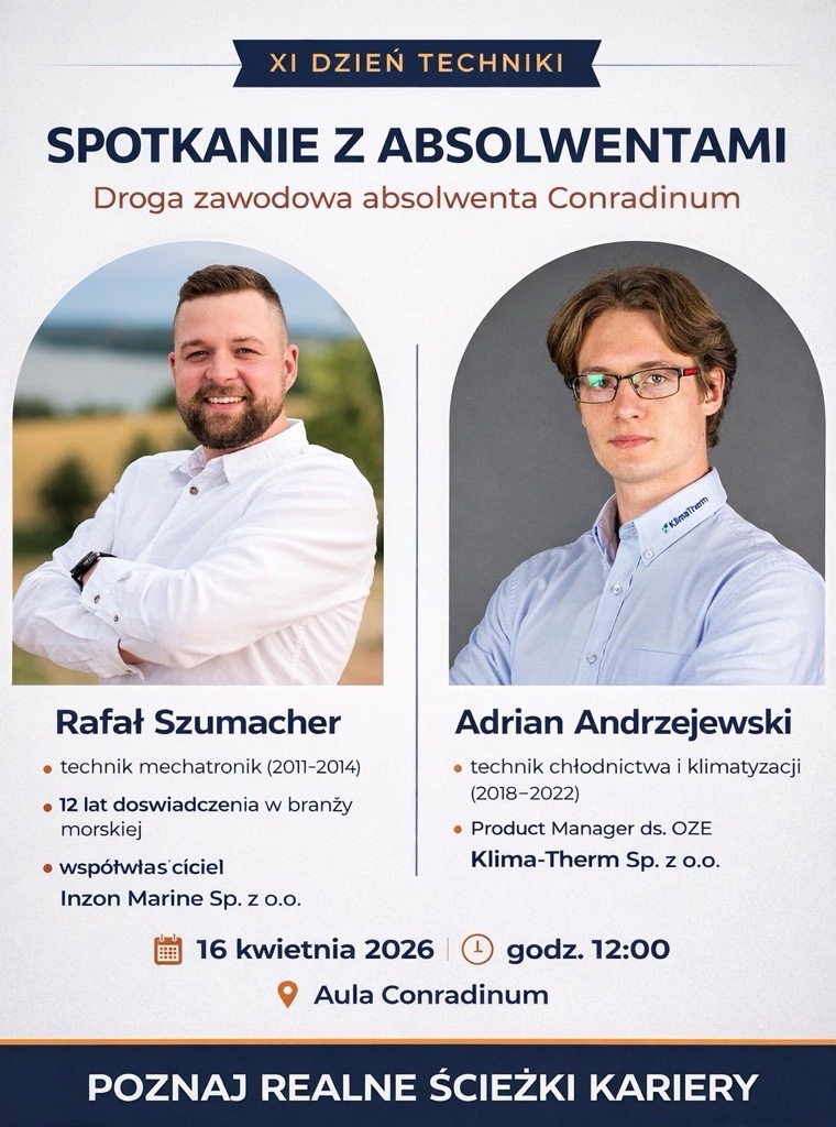 Już 16 kwietnia podczas XI Dnia Techniki pokażemy, jak naprawdę wygląda droga od szkoły do zawodu. 📍 Aula Conradinum 🕛 godz. 12:00 Poznaj historie, które zaczęły się dokładnie tu.