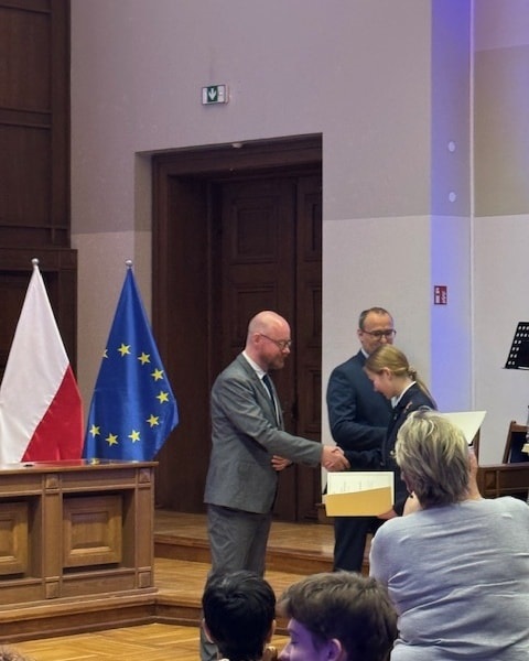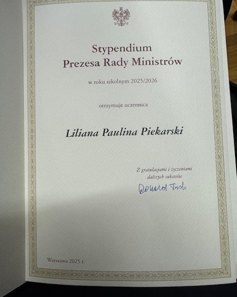 Lilianna Piekarski z kl. 3 A (wych. p. Marzena Celińska) odebrała z rąk Wicewojewody Pomorskiego p. Emila Rojka i Pomorskiego Kuratora Oświaty p. Grzegorza Krygera Stypendium Prezesa Rady Ministrów za wyniki w nauce.