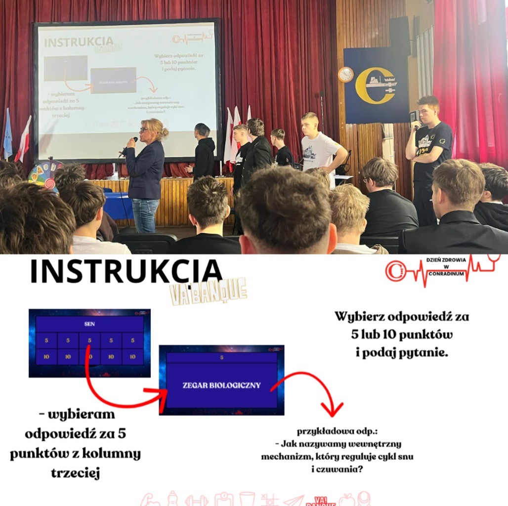 Uczniowie klas pierwszych zmierzyli się w różnorodnych konkurencjach, takich jak sprawnościowe „kółko i krzyżyk”, „Koło fortuny: zjedz fast food i spal te kalorie”, „Va Banque o śnie” oraz test wiedzy „Prawda czy fałsz o energetykach i napojach izotonicznych”. Nie zabrakło emocji, zdrowej rywalizacji, a także… dogrywki, która dostarczyła uczestnikom dodatkowych wrażeń.
