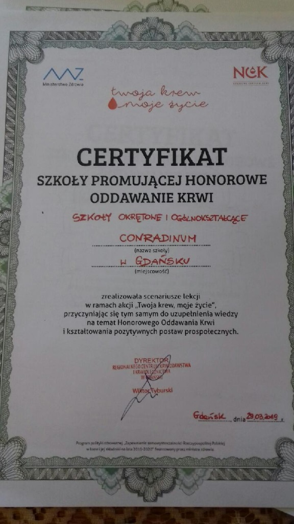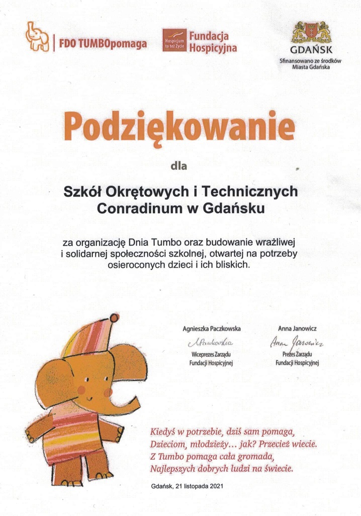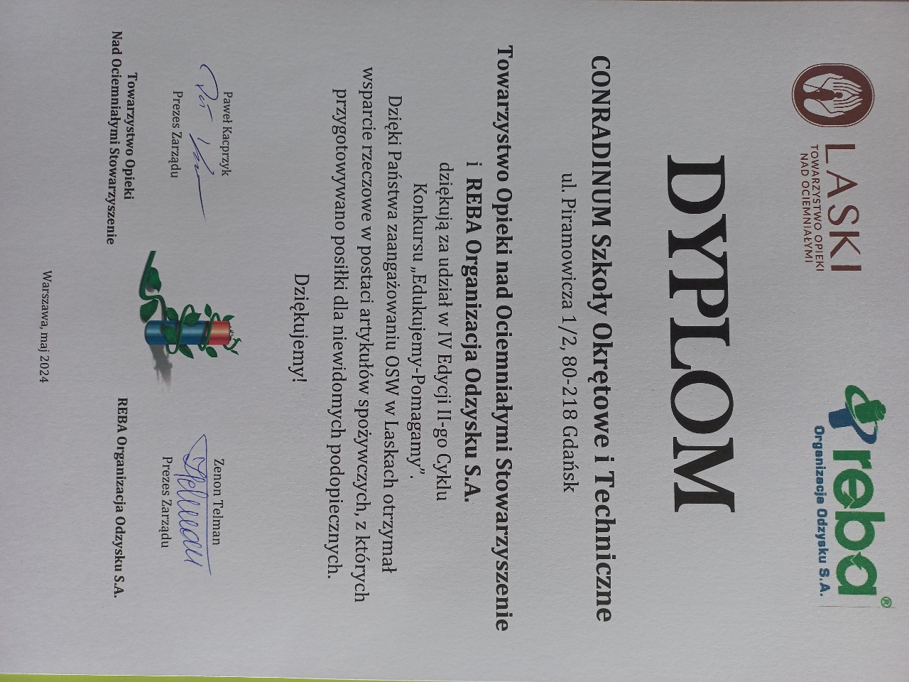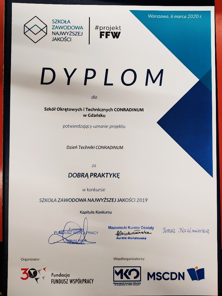 Dyplomy/podziękowania - Szkoły Okrętowe i Ogólnokształcące CONRADINUM (XVIII Liceum Ogólnokształcące, Technikum nr 18, Branżowa Szkoła I stopnia nr 18)